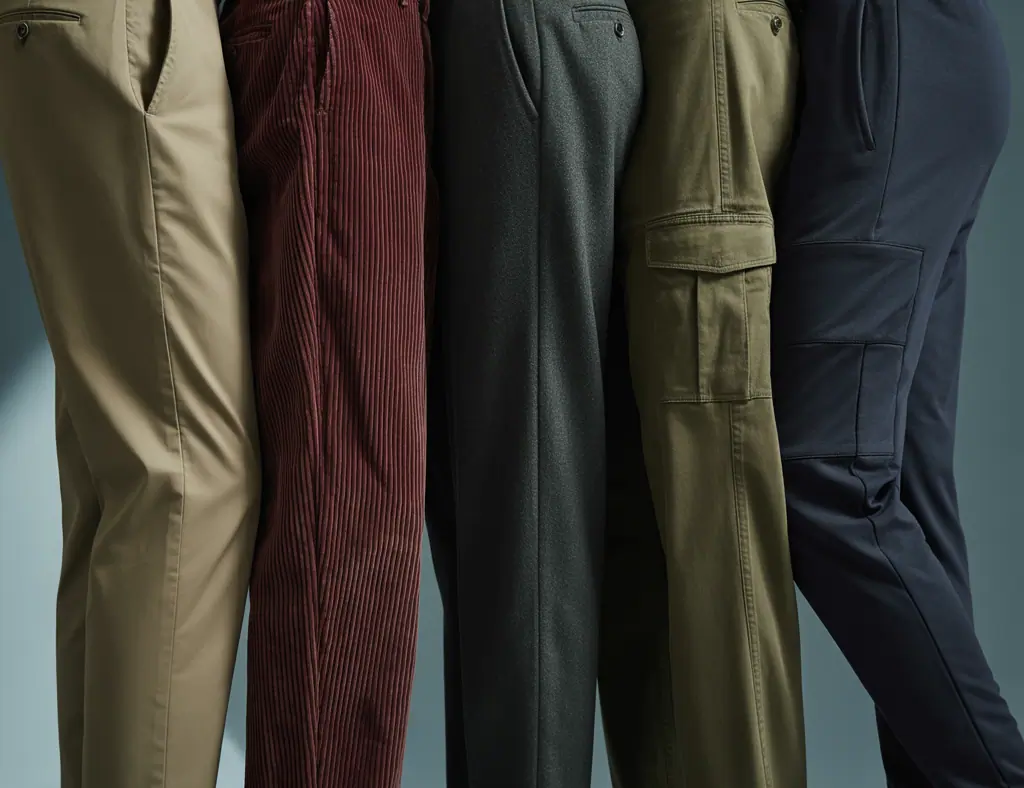 Focus on three things: fit, fabric, and color. A modern fit (slim but not skinny, tapered or straight-leg) flatters most body types. Fabrics matter — cotton twill, wool blends, corduroy, and stretch technical weaves each bring different functionality. Finally, start with neutral colors (navy, olive, charcoal, khaki) and add seasonal or statement shades later.