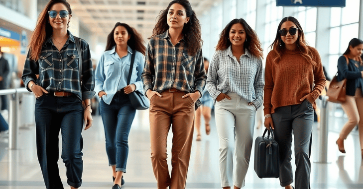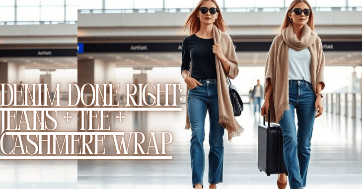 | 4. Jeans + Tee + Cashmere Wrap | Soft straight-leg jeans, t-shirt, flats | Cashmere/wool wrap doubles as a blanket; avoid tight jeans | Classic casual look for short flights |