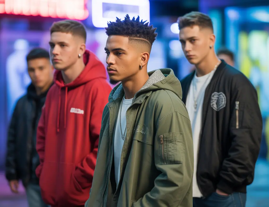 - Layered for colder months: Hoodie under a bomber jacket, fitted jeans, and boot-style sneakers compliments a textured top fade.