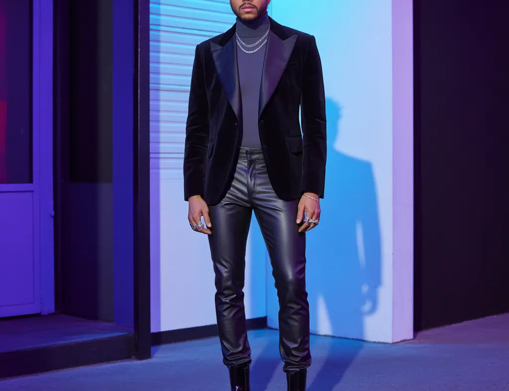 - Smart-casual Starboy: Velvet or sequined blazer + white tee + tapered black trousers + black loafers. Keep accessories minimal — one statement ring or a watch.